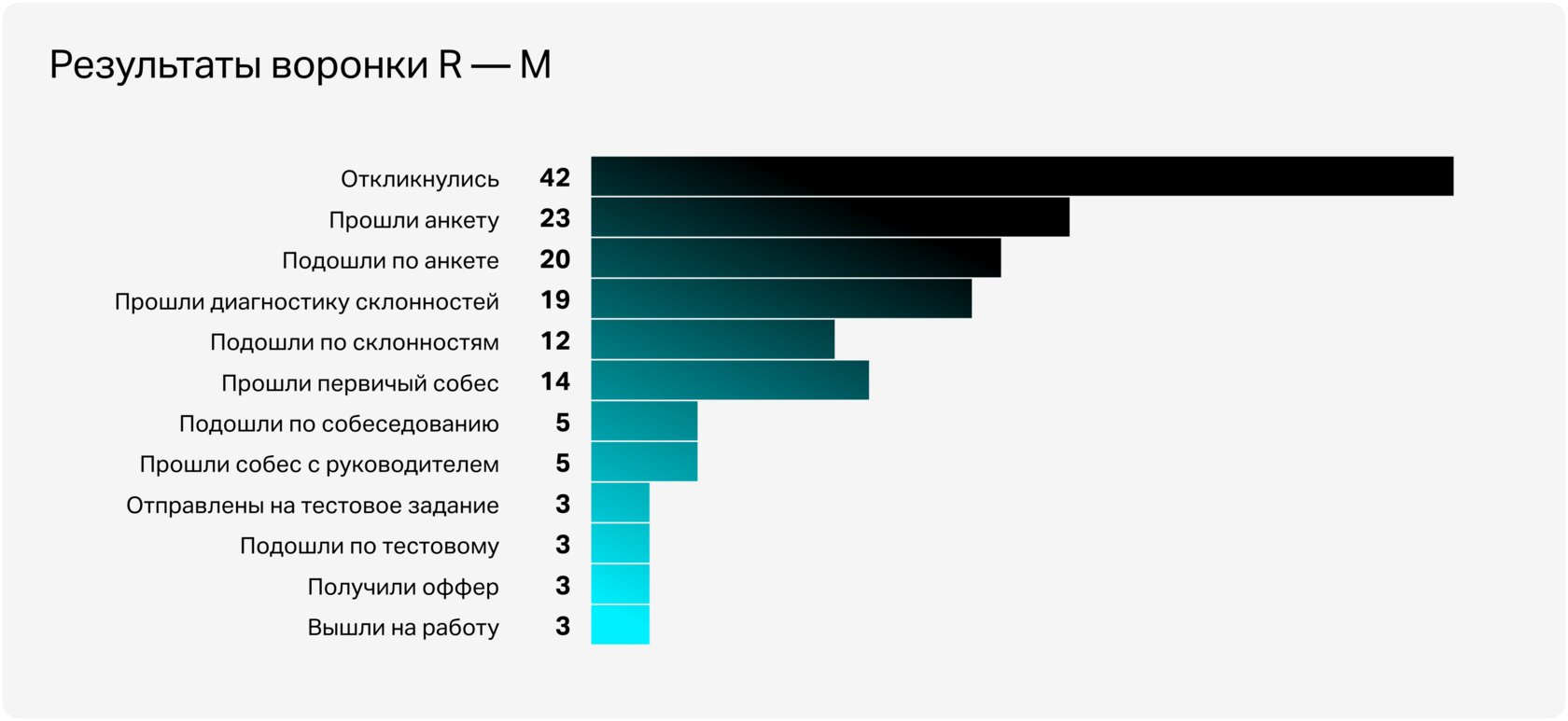 Из-за высоких профессиональных требований, узкой специализации — количества людей в воронке было недостаточно для прогнозируемого результата. Приняли решение рассматривать дополнительные профили склонностей.