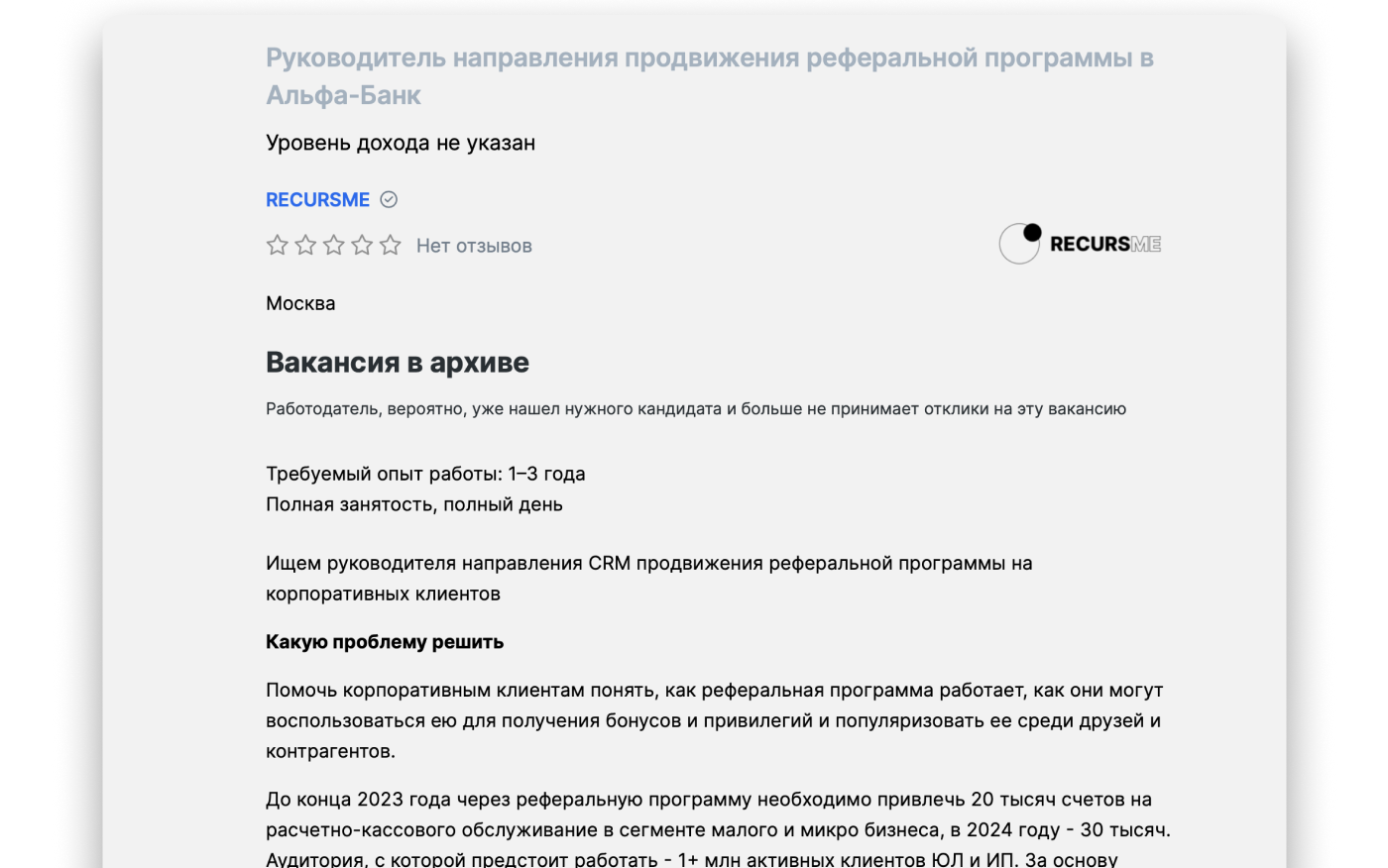 Из профиля должности собрали текст вакансии. Текст отличается от структуры, принятой в банке, поэтому было принято решение размещать вакансии на hh.ru от сервиса Рекурсми.