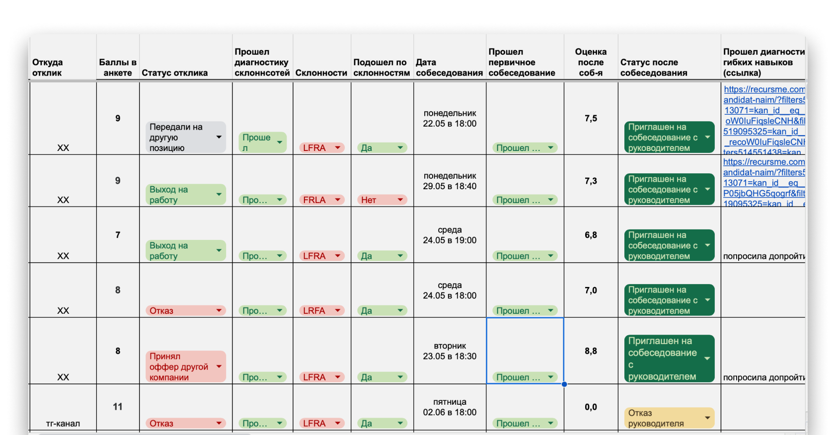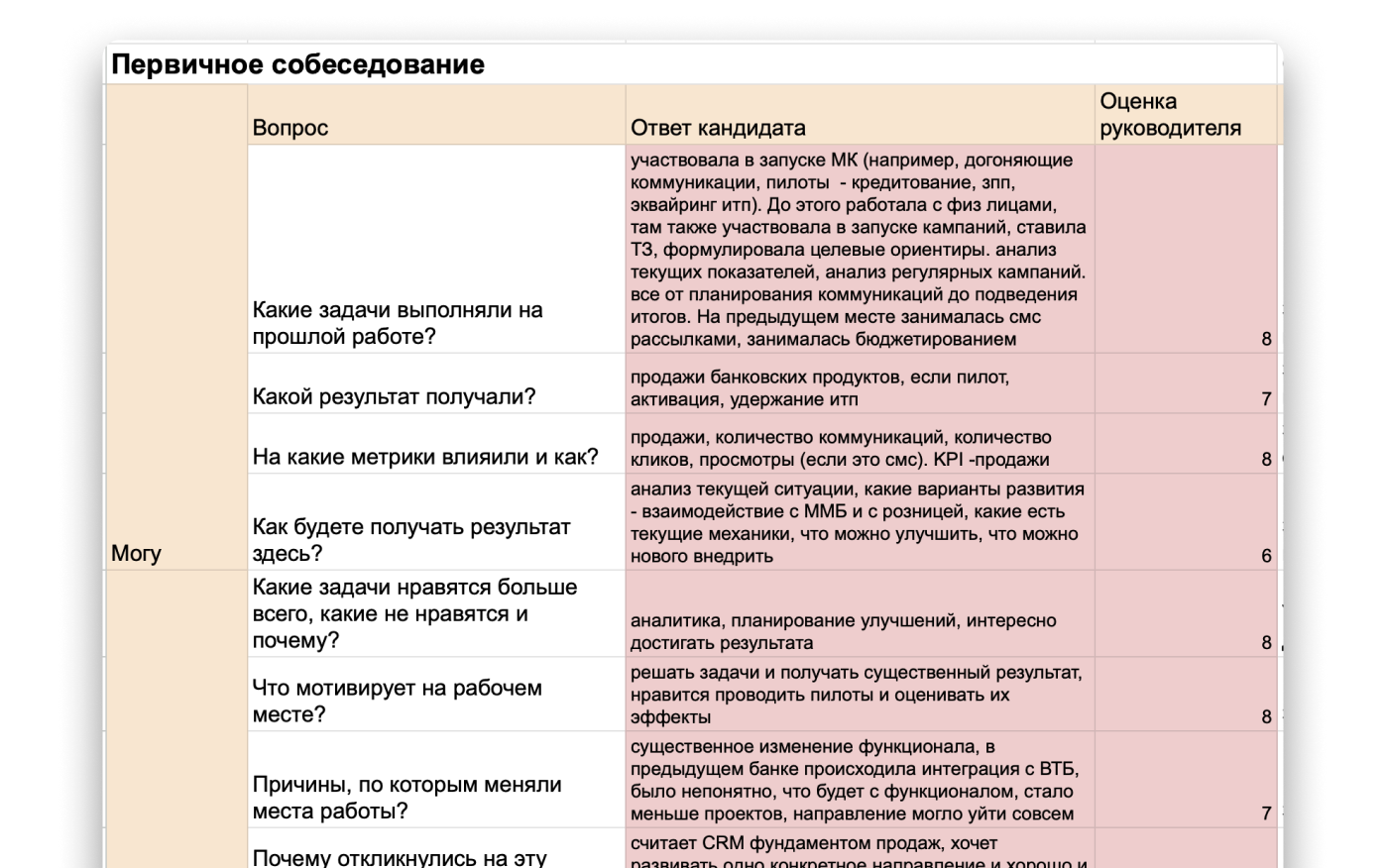 После 14 первичных собеседований всего 5 кандидатов были рекомендованы к собеседованию с руководителем. Задача собеседования с руководителем — дополнить картину по метрикам, которые были собраны в ходе отбора и продать тестовое задание. Руководителю выдали инструкцию перед собеседованием и попросили оценить ответы кандидатов по 10 балльной шкале после.